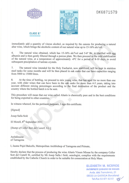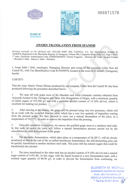 Hương vị rượu: Được lên men tự nhiên từ giống nho trắng ngon ngọt Garnacha, giống nho này cho nước ép màu vàng nhạt và mang đến hương thơm của táo xanh kết hợp với quả hạch. Vinum Altaris Misae là một loại rượu ngọt tự nhiên gợi lên rõ ràng của nho trắng Garnacha
