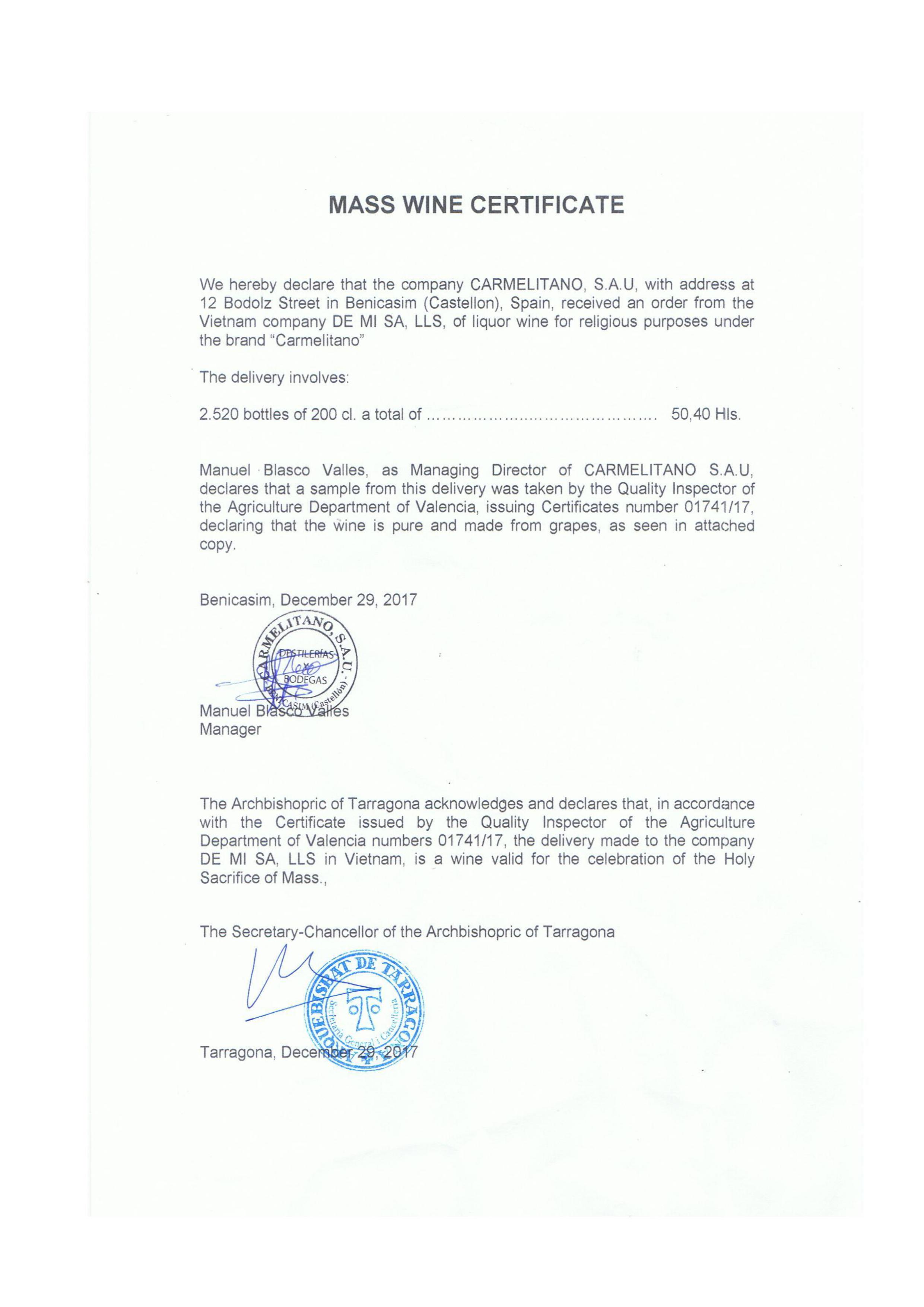 Lịch sử hãng rượu: Vào thế kỷ 17, bao gồm Carmelites, Fray Antonio de Jesús María, một học giả hàng đầu và am hiểu về các loại thảo mộc thơm đã đến vùng núi ở sa mạc Palmas nơi họ xây dựng một tu viện. Khi trở thành một Novitiate House, nhu cầu của những người mới về việc học tập và đào tạo cần phải được đáp ứng. Với những lý do trên, họ đã nghĩ đến việc thương mại hóa một thức uống thơm ngon và được chiết xuất từ vô số các loại thảo mộc ở bản địa từ vùng núi sa mạc Palm. Rượu lễ Carmelitano được nghiên cứu sản xuất vào năm 1896 theo quy trình thủ công một cách kỹ lưỡng để đạt độ tinh khiết nhất với những quả nho được chọn lọc và lên men với các loại men đặc biệt đảm bảo chất lượng tốt nhất.