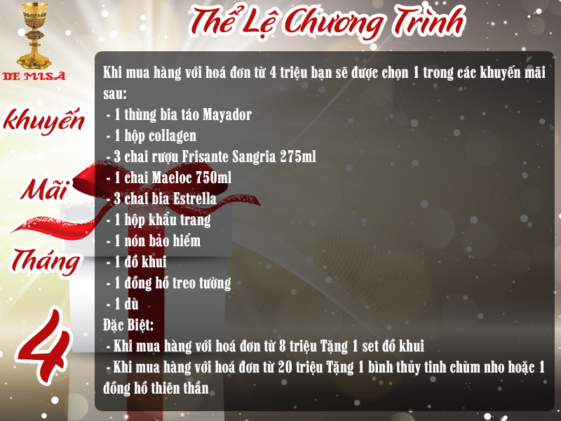 Nhằm gửi lời cảm ơn đến Quý khách hàng đã tin tưởng sản phẩm của Công ty De Misa, chúng tôi đem đến cho Quý khách hàng chương trình khuyến mãi tháng 4 đầy hấp dẫn cho khách hàng toàn quốc.