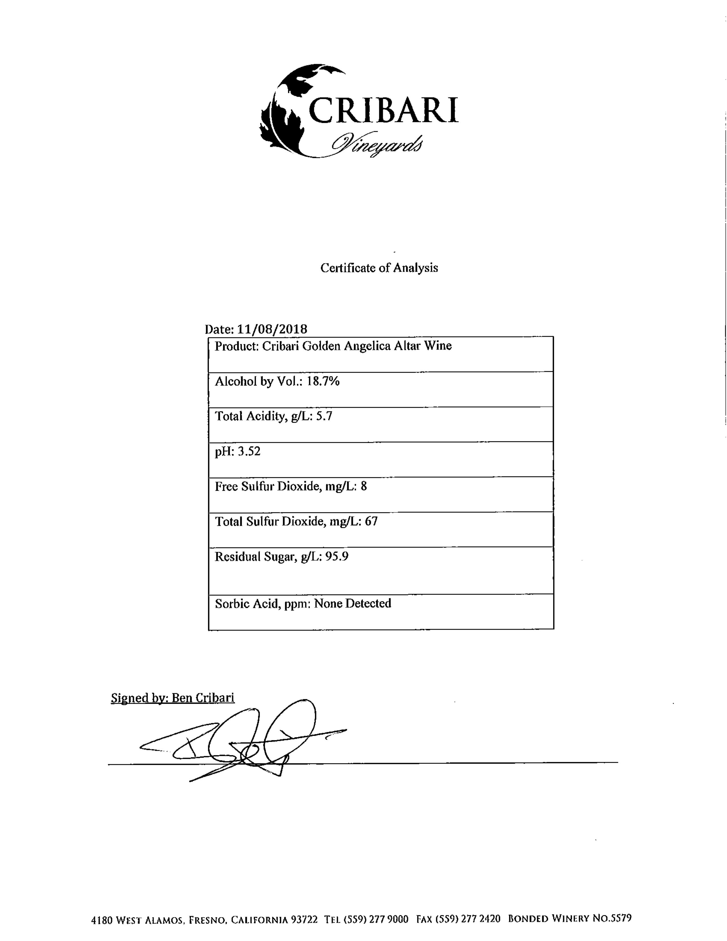 Rượu lễ Cribari được lên men tự nhiên từ giống nho trắng tươi xanh chín mọng từ các cánh đồng nho ở Pháp. Đức Thánh Cha John Paul sử dụng rượu của Cribari trong đại hội giới trẻ thứ 17 ở Canada. Được sản xuất và lưu trữ có nguồn gốc từ các hầm rượu của Pháp. Là một trong những loại rượu phổ biến nhất của hãng, và được ví là rượu của các thiên thần..