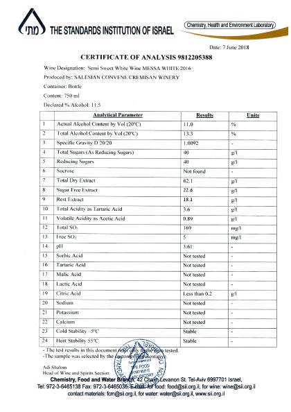 Quy trình sản xuất và hương vị: Rượu lễ Cremisan được làm từ giống nho trắng nên màu rượu rất tự nhiên, màu vàng thanh mát dịu dàng, vị ngọt thơm thoang thoảng mùi hoa cỏ đồng nội tạo cảm giác sảng khoái. Rượu lễ Cremisan được lên men tự nhiên từ những quả nho chín mọng được tuyển chọn sau đó được lên men trong thùng thép không gỉ. Tiếp tục được ủ trong những thùng gỗ sồi trưởng thành. Qúa trình được kiểm soát gắt gao để đảm bảo chất lượng vang cuối cùng đúng theo tiêu chuẩn.