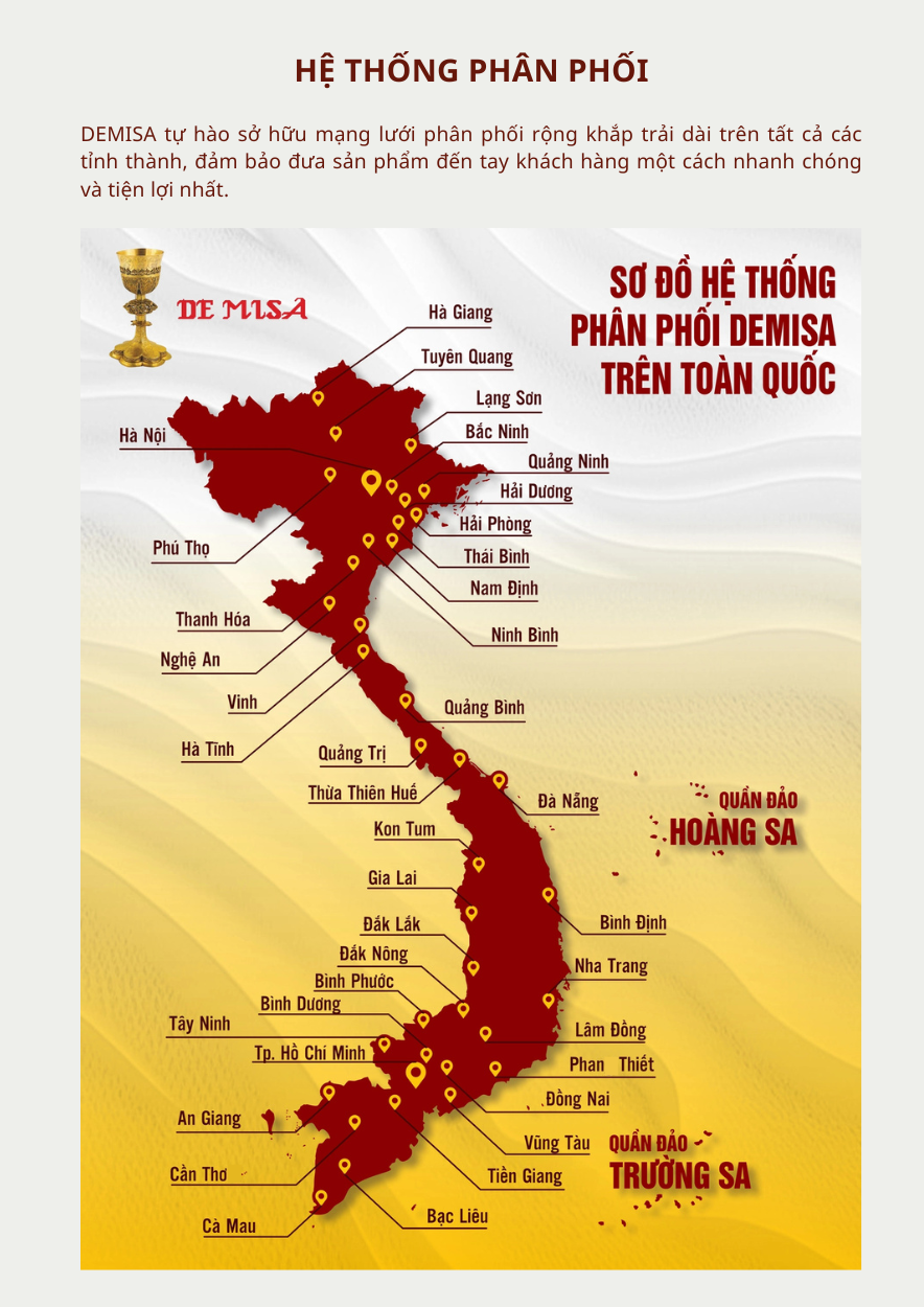 DEMISA tự hào sở hữu mạng lưới phân phối rộng khắp trải dài trên tất cả các tỉnh thành, đảm bảo đưa sản phẩm đến tay khách hàng một cách nhanh chóng và tiện lợi nhất.
