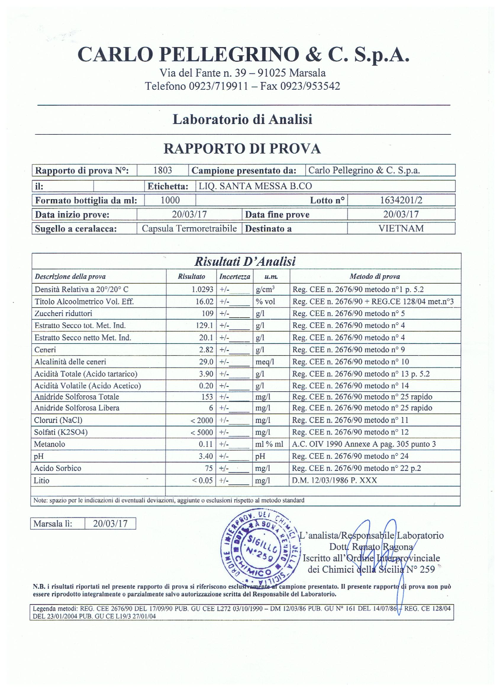 Lịch sử hãng rượu: Cantine Pellegrino được thành lập năm 1880 và trải qua 6 thế hệ. Ngày nay, gia đình Pellegrino luôn trực tiếp quản lý các hoạt động ở công ty lẫn trong vườn nho và trong cả hầm rượu cho dù gia đình đã tới thế hệ thứ bảy. Các trang trại của gia đình Pellegrino trải dài hơn 300 ha trên nhiều loại đất và vi khí hậu. Từ những truyền thống trồng nho và những kinh nghiệm đã được tích lũy ở trên đảo. Có hơn 300 người trồng cung cấp nho được trông trên đảo cho Pellegrino. Cantine Pellegrino đã đầu tư nguồn lực đáng kể và đang tích cực thúc đẩy việc sản xuất rượu vang Moscatos và nho khô nổi tiếng. Nhờ các khu vực trồng trọt khác biệt mà nhà máy của chúng tôi có thể cung cấp và tạo ra sự đa dạng trong các loại rượu vang.